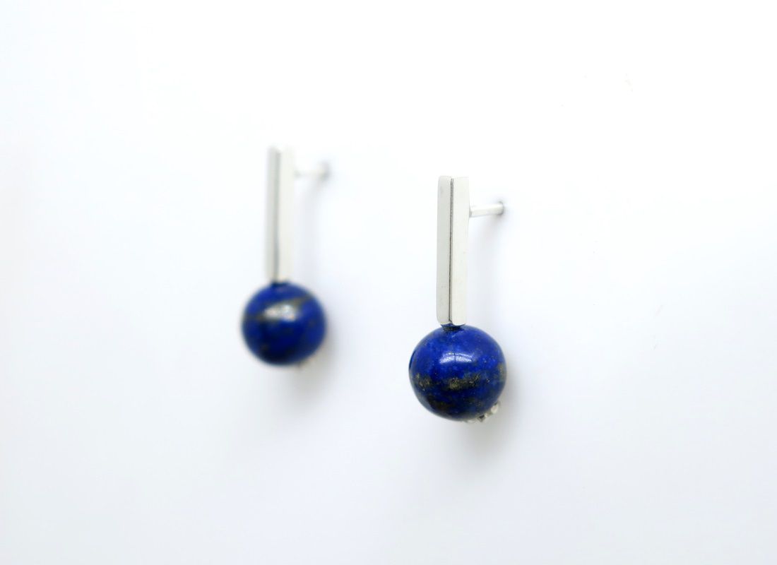 Brinco Slim em prata 950 com esfera lisa de lápis lazuli. Brinco com pedra fixa, de pino.