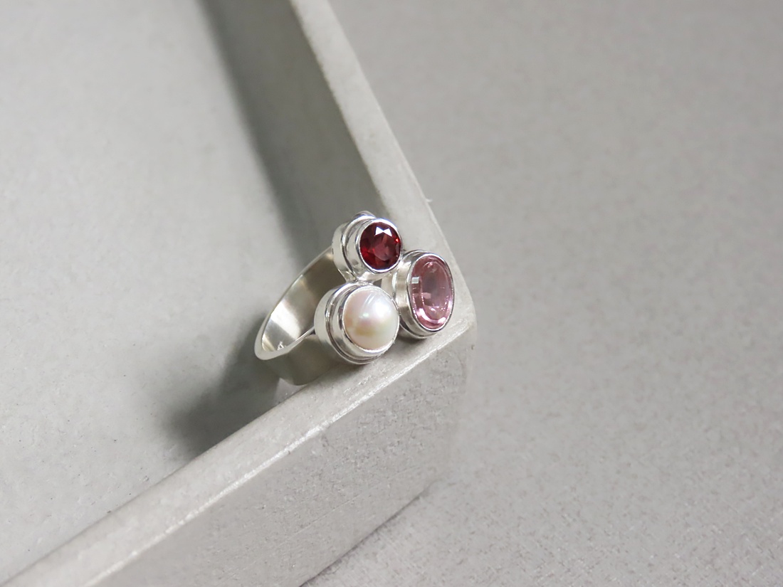 Anel trio com Pérola, Turmalina e Granada, em prata 950.