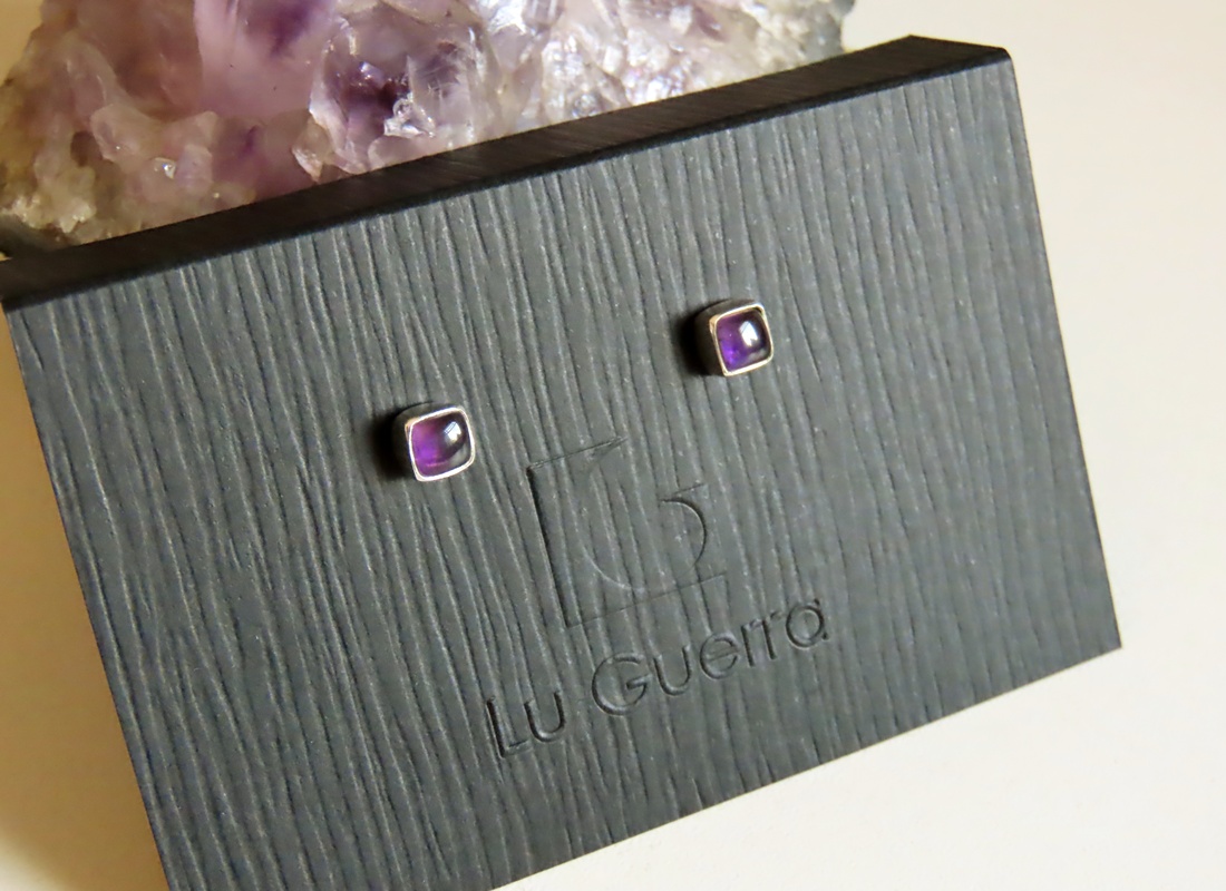 Brinco Caixa Quadrado Ametista. Brinco articulado, de pino em Prata 950.