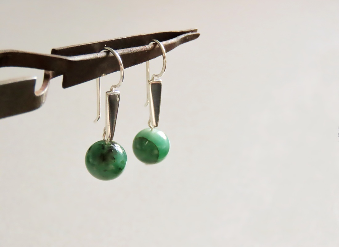 Brinco Gancho Exclamação com Esmeralda. Confeccionada em prata 950.