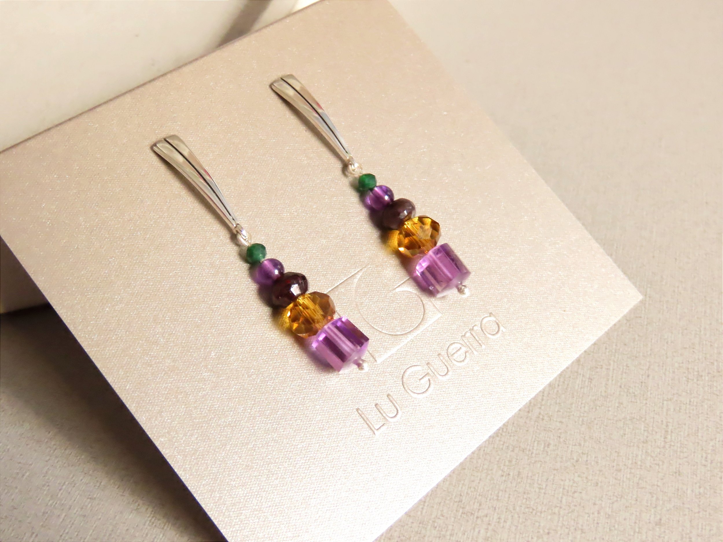 Brinco Iara Longo em prata 950 com Ametista, Citrino, Granada e Esmeralda.