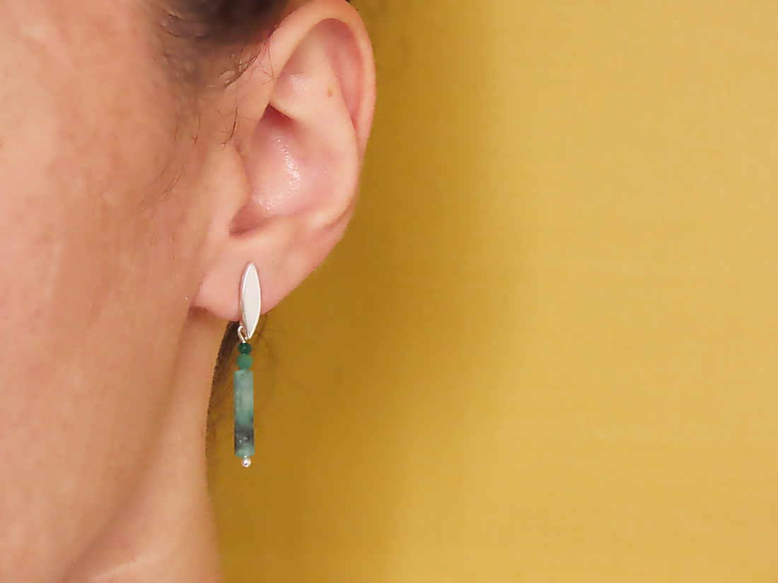 Brinco Navete Trilogia com Esmeralda Pequeno em prata 950. Brinco com movimento.