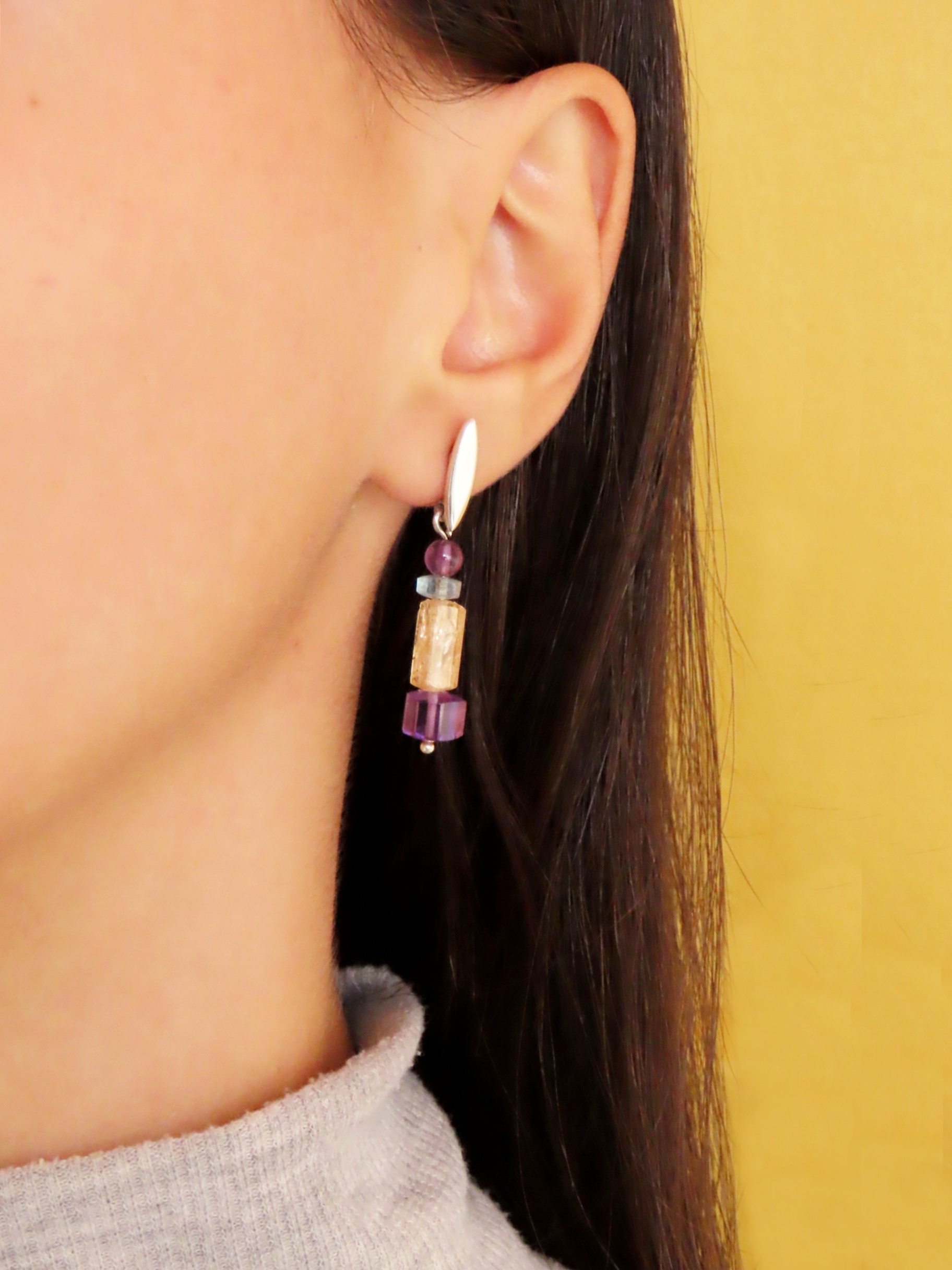 Brinco Navete Trilogia com Ametista, Água Marinha, e Topázio Imperial. Em prata 950 brinco com movimento.