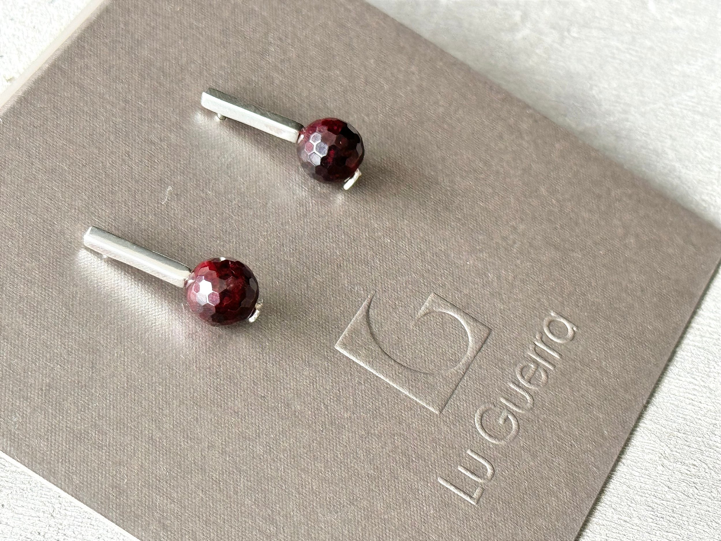 Brinco Slim em prata 950 com esfera facetada de Granada. Brinco com pedra fixa, de pino.