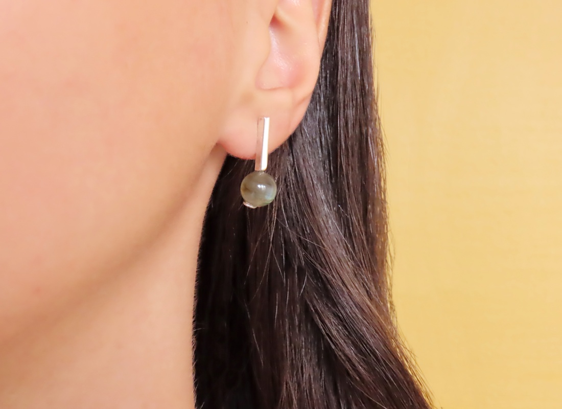 Brinco Slim em prata 950 com esfera lisa de Labradorita. Brinco com pedra fixa, de pino.