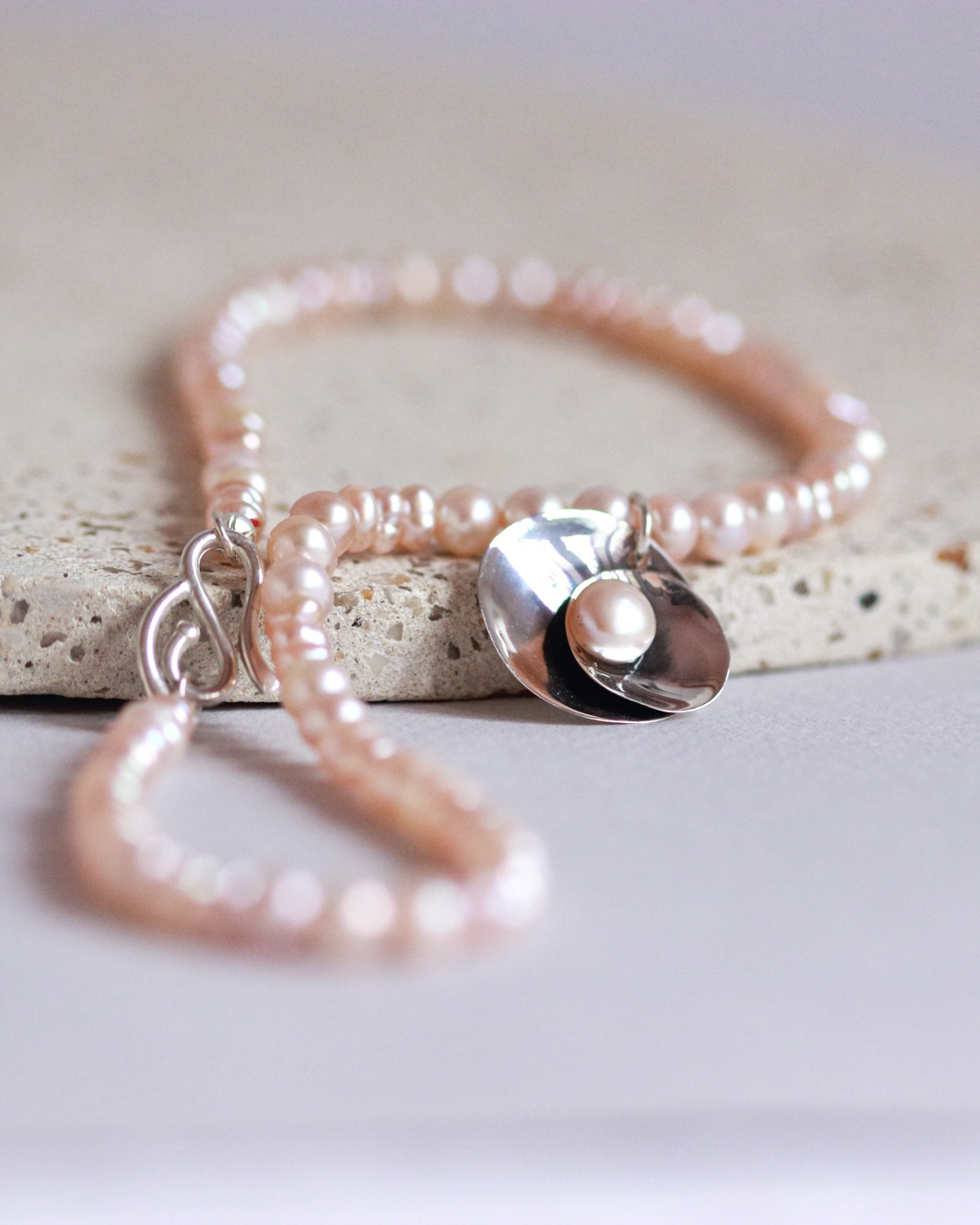 Colar Concha com Péroal Biwa Rosa, com pingente remetendo á concha e Pérola. Fecho exclusivo em prata 950.