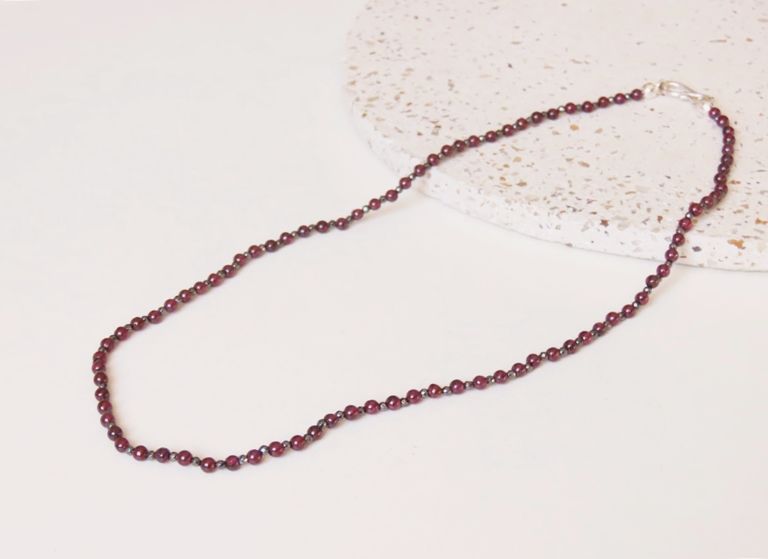 Colar delicada com Granada e Hematita, fecho em prata 950.