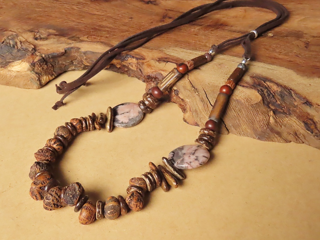 COLAR ÉTNICO JASPE, FLAMBOYANT E MADEIRAS DIVERSAS