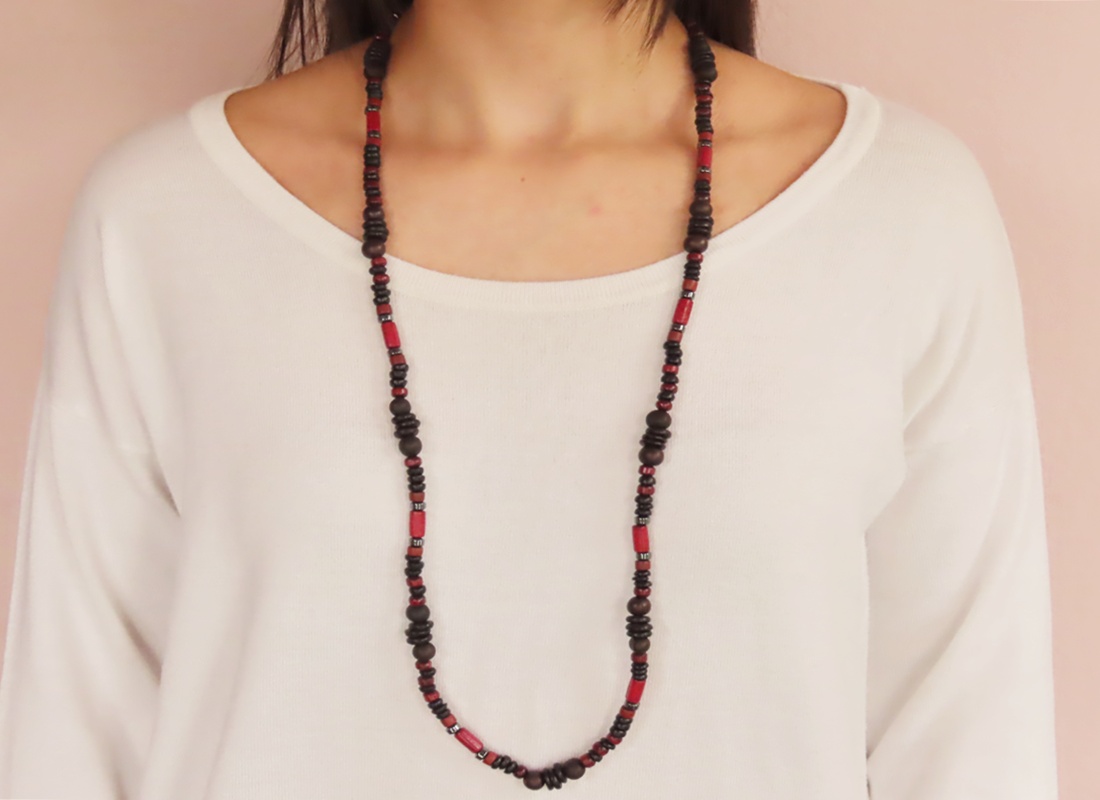 Colar Étnico com Hematita, Coco, Flamboyant, Açai e Madeiras Diversas. Fecho exclusivo em Prata 950.