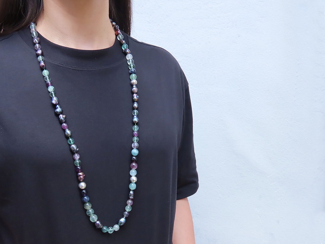 Colar Longo com Pérola Negra, Ametista e Fluorita. Fecho exclusivo em prata 950.
