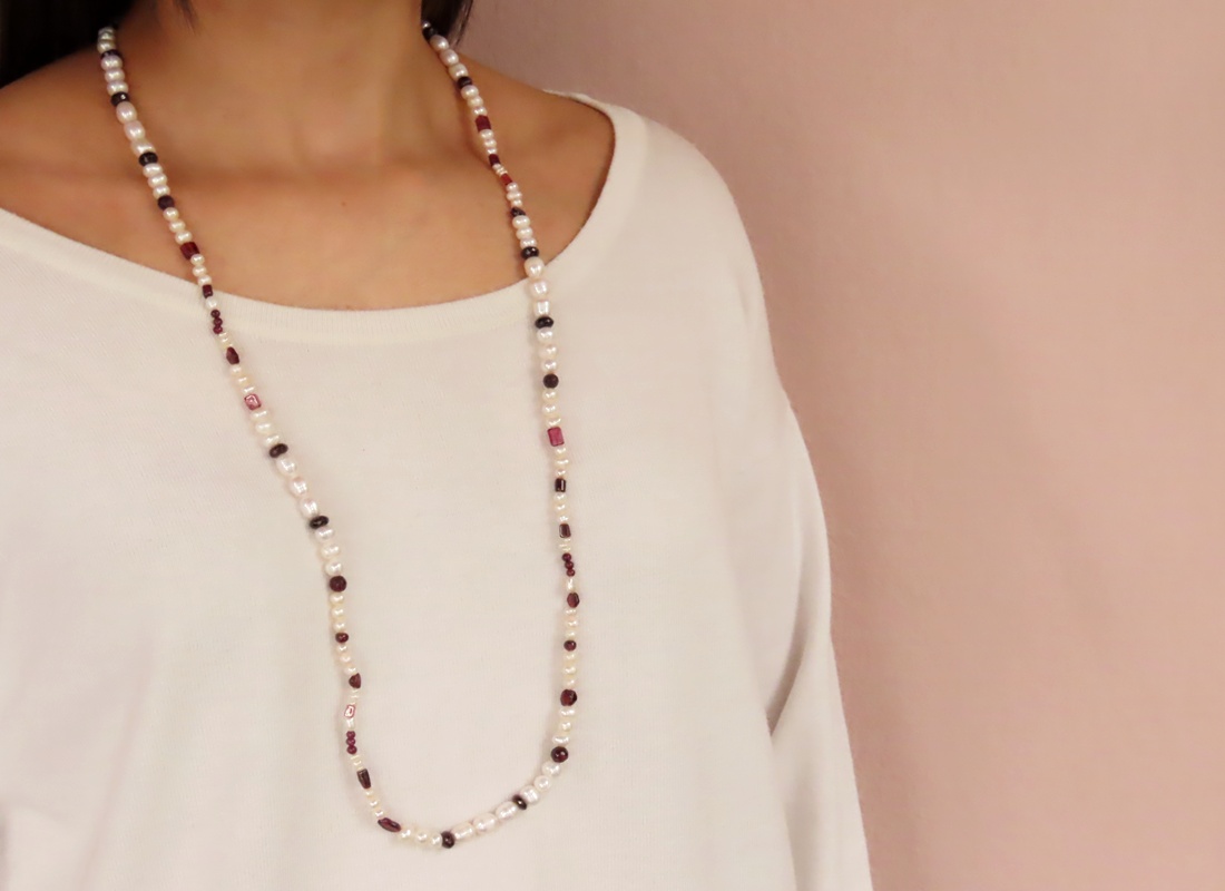 Colar Lúdico Pérola Biwa e Granada. Peça única e versátil que combina com tudo. Fecho exclusivo em Prata 950.