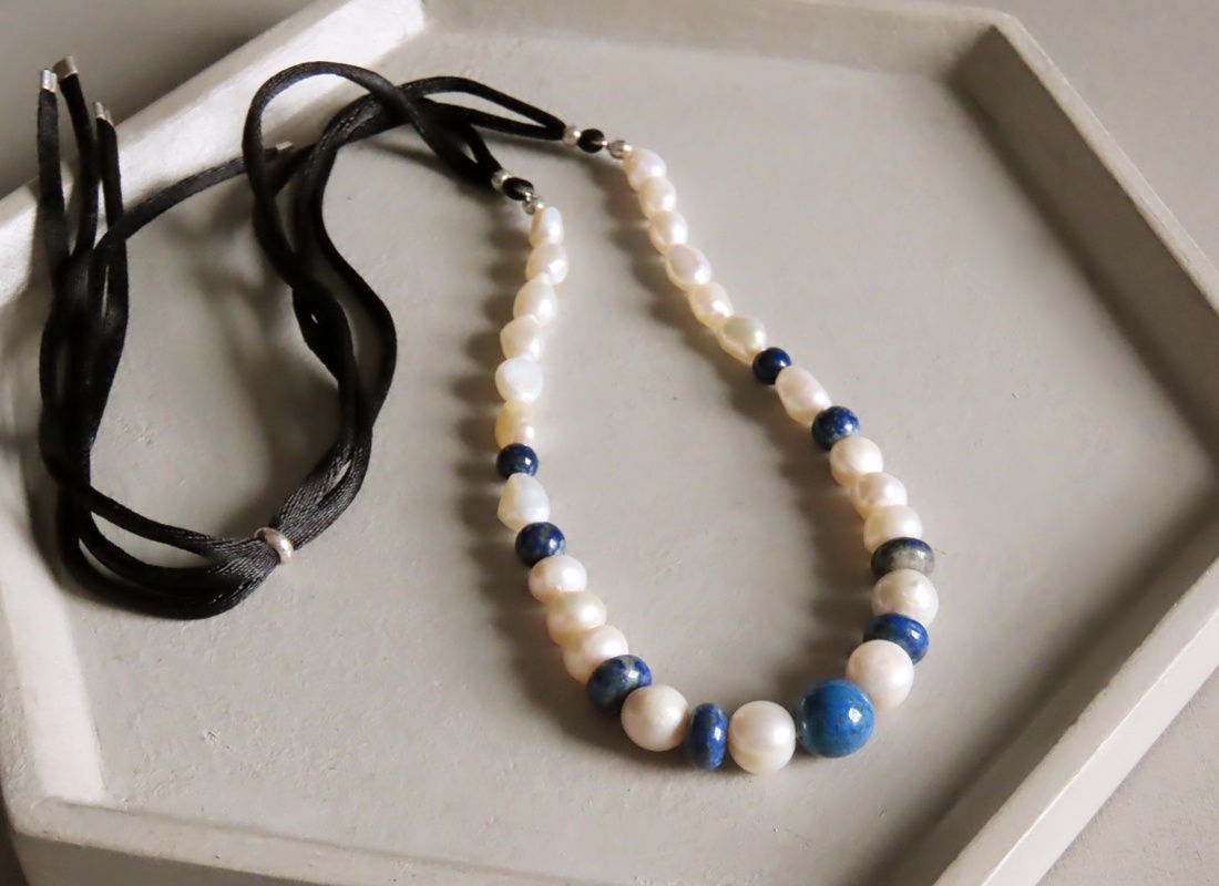 COLAR SEDA PÉROLA BIWA E LÁPIS LAZULI II PÉROLA BIWA