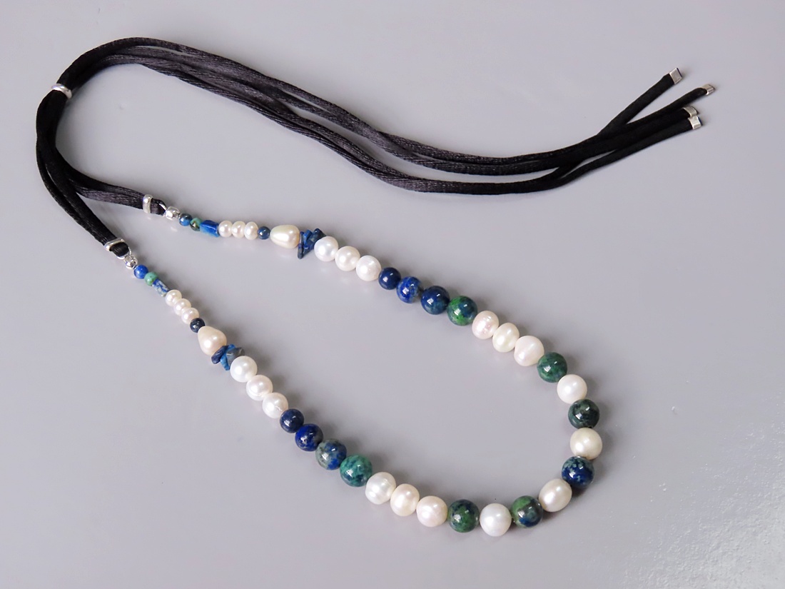 Colar Seda com Lápis Lazuli, Pérola Biwa e Turquesa Africana. Cordão de seda preto com acabamento em prata 950.