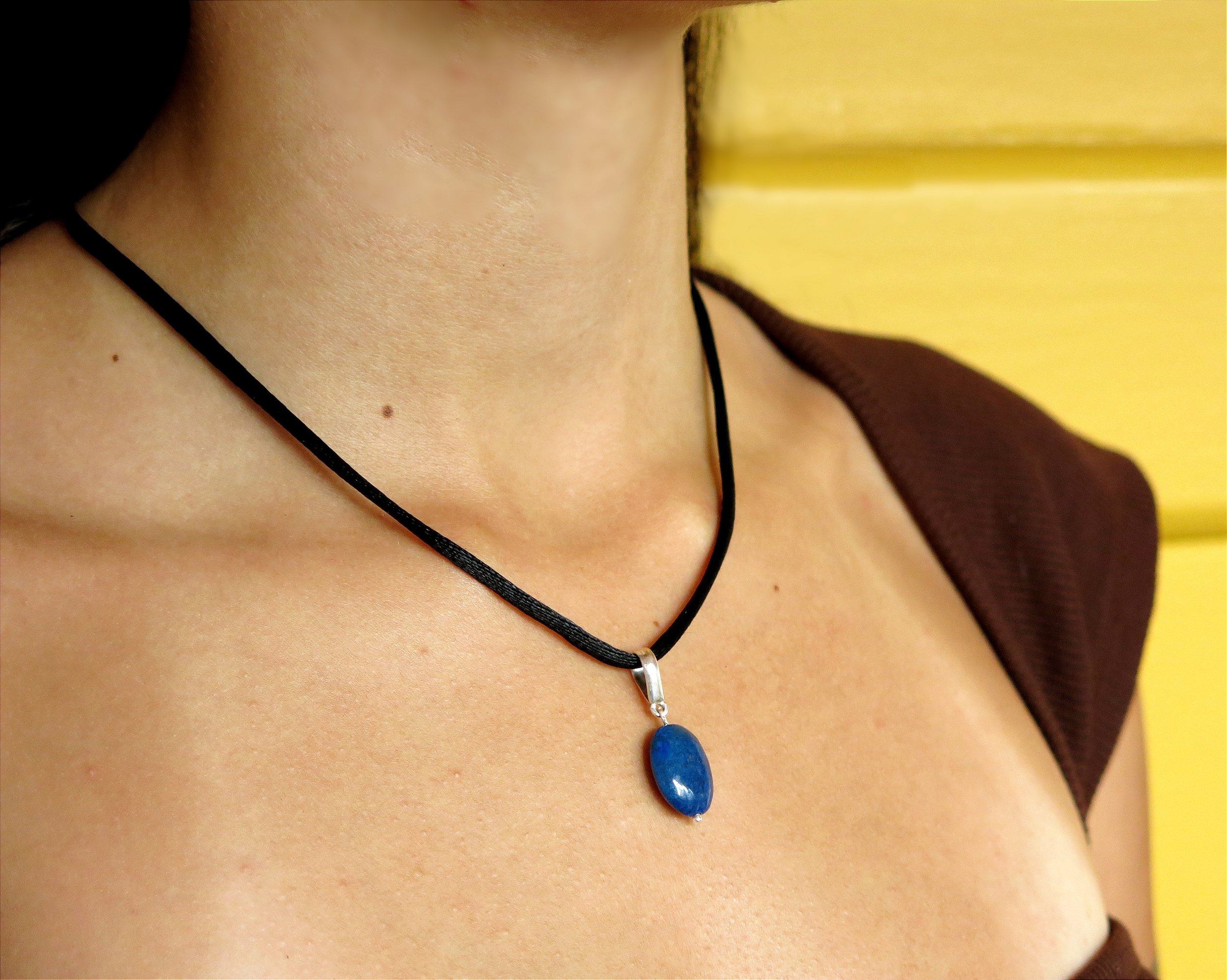 Pingente de lápis lazuli em forma de oval. Cordão de seda preto regulável com acabamento em prata 950.