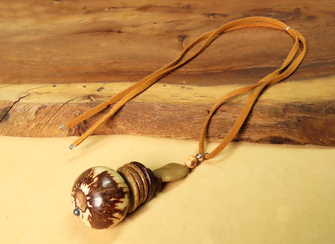 Pêndulo com Jarina, Coco e Madeiras Diversas. Cordão de camurça caramelo regulável com acabamento em prata 950.