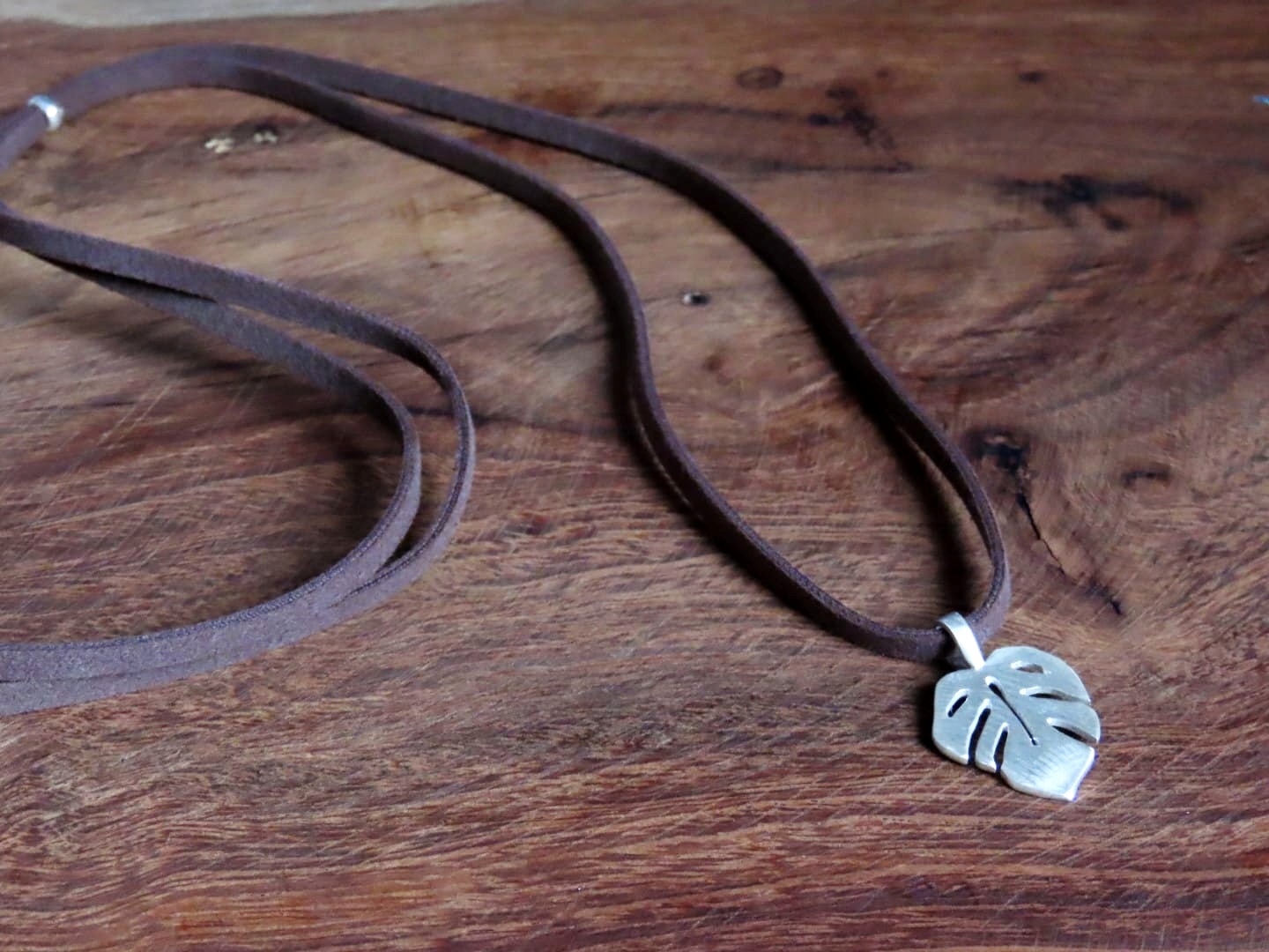 Pingente Costela de Adão. Cordão de camurça Chocolate regulável com acabamento em prata 950.