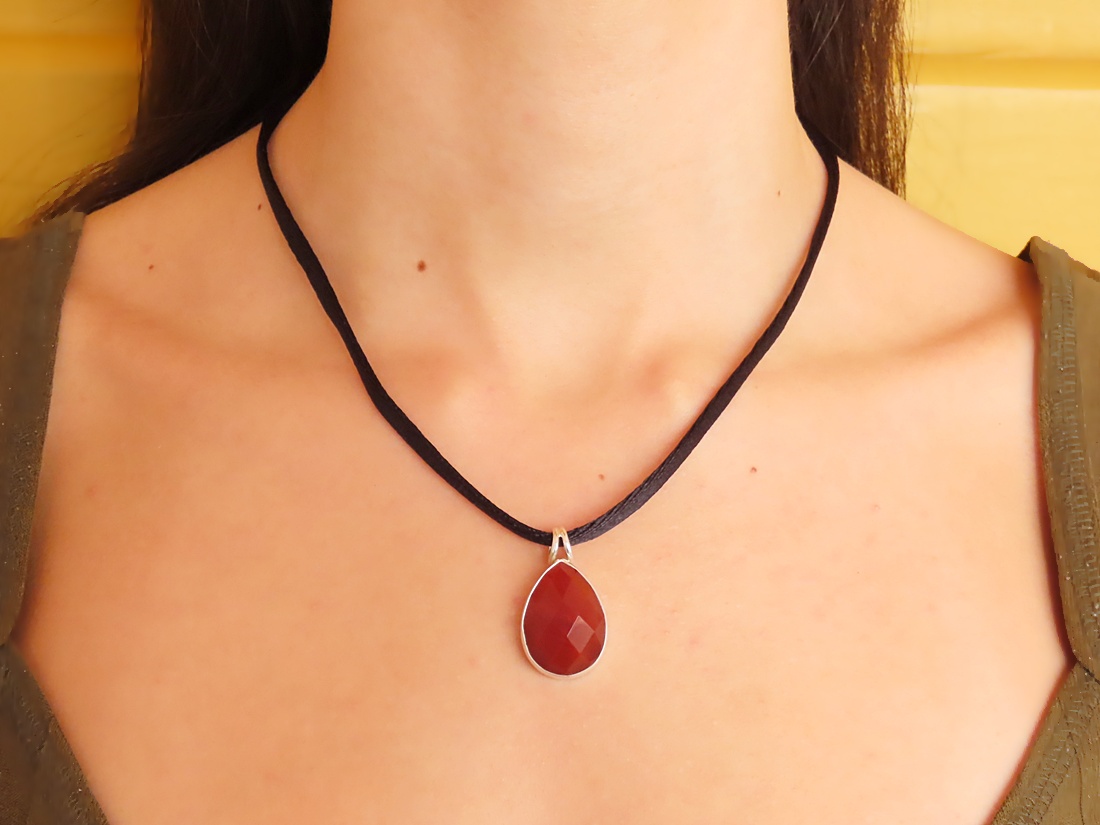 Pingente Caixa Gota Cornalina Facetada. Cordão de seda preto com acabamento em prata 950.