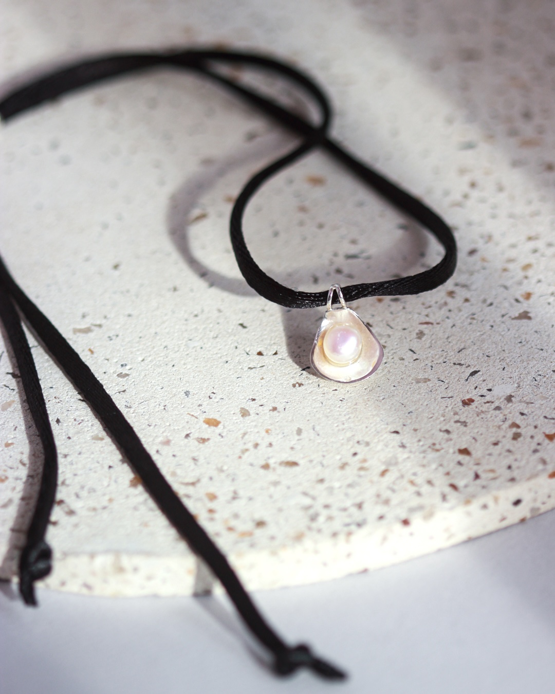 Pingente Concha com Pérola. Cordão de seda preto com acabamento em prata 950.