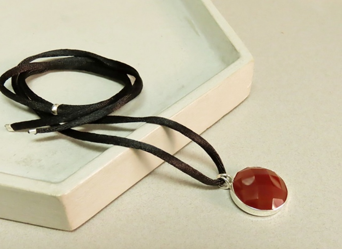 Pingente Caixa Cornalina Facetada II. Cordão de seda preto com acabamento em prata 950.