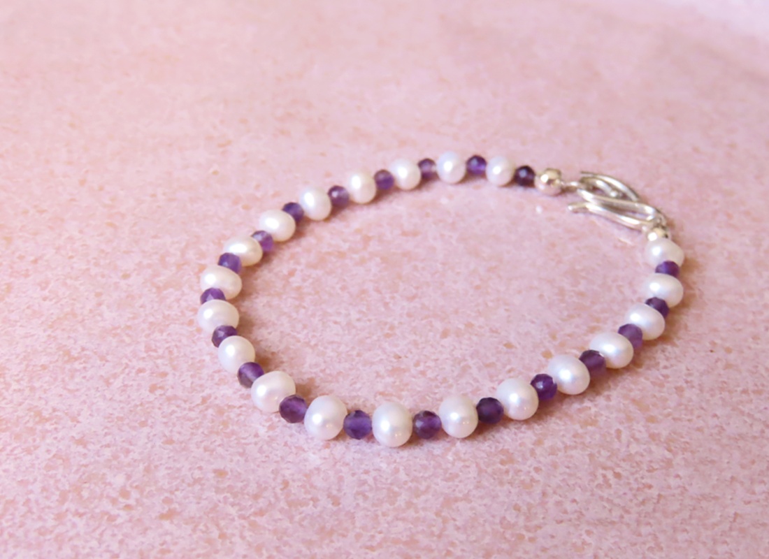 Pulseira delicado com Pérola Biwa e Ametista. Fecho exclusivo em prata 950.