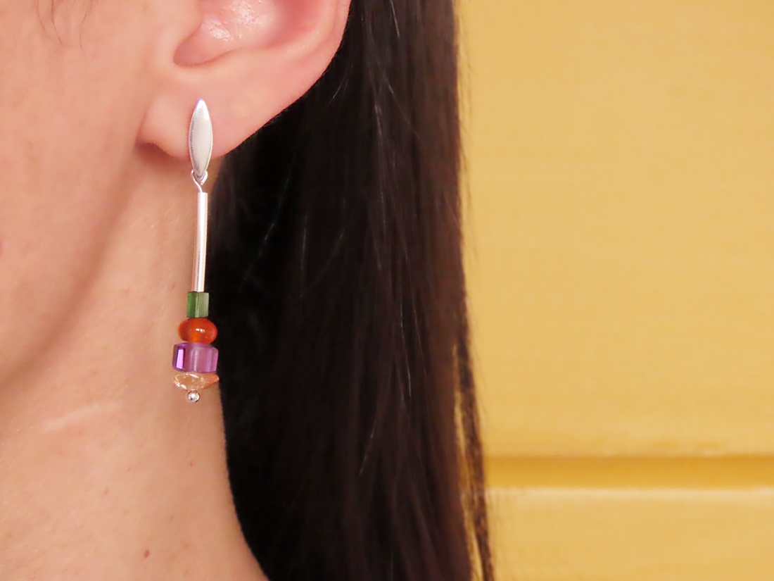 Brinco Navete Longo com Turmalinas, Ametista e Topázio Imperial. Em prata 950 brinco com movimento.